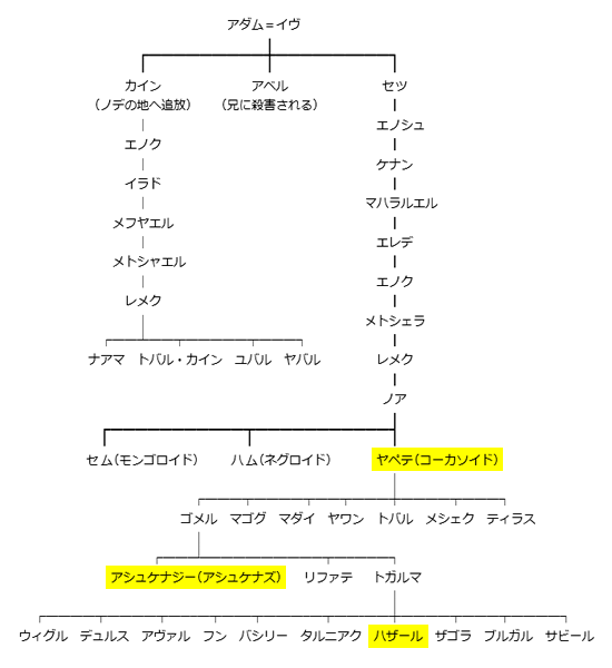 ↑上はアダムからノアの3番目の息子ヤペテ(コーカソイド)の子孫までの血統図であるが、